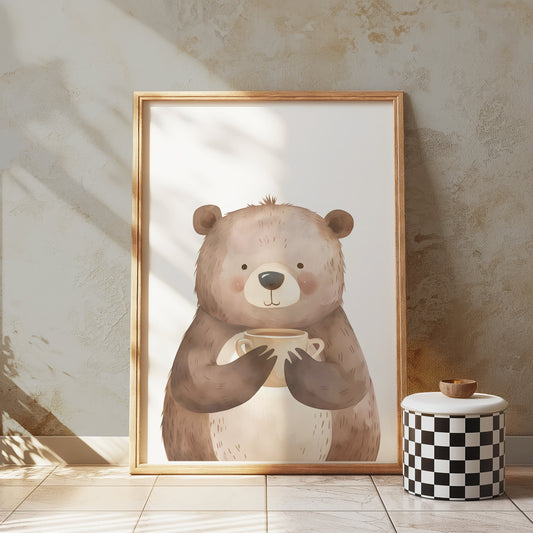 Adorable Bear Holding a Cup Illustration Wall Art Posters