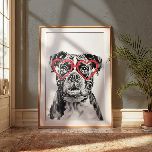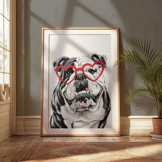 Adorable Bulldog with Heart Glasses Wall Art Posters