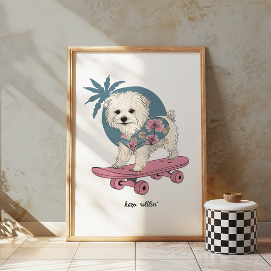 Adorable Puppy on Skateboard with Floral Design Posters