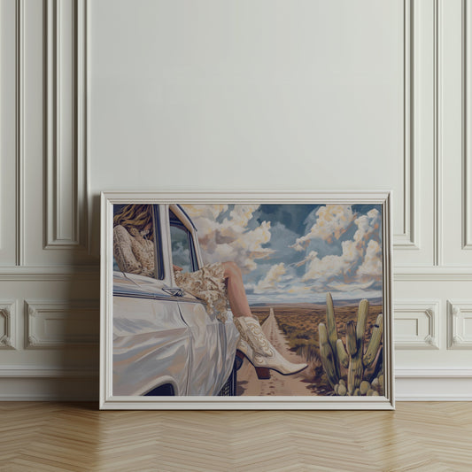 Adventure in Desert Road with White Car Artwork Posters