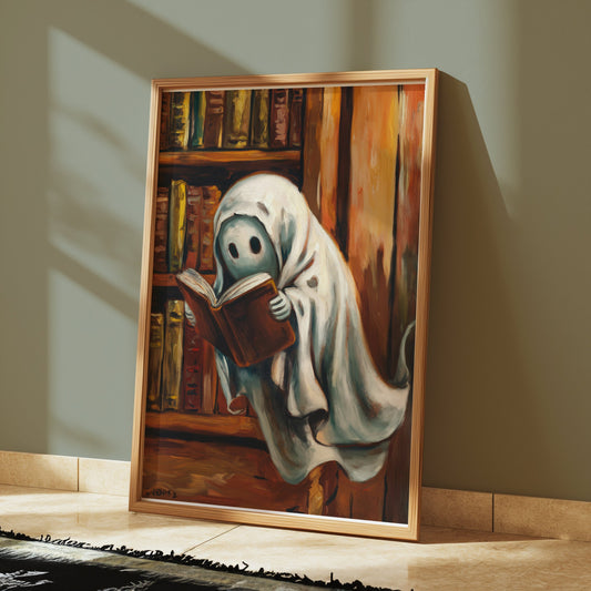 Spooky Ghost Reading Book in Library Wall Art Posters