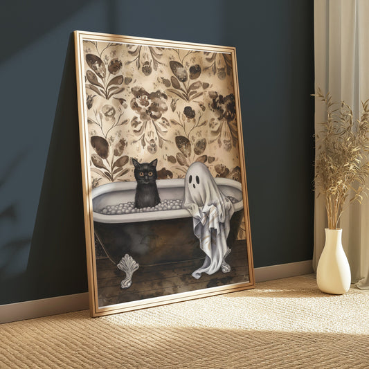 Ghost and Cat in Bathtub Halloween Art Print Posters