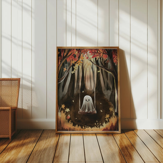 Spooky Ghost on Swing in Autumn Forest Art Posters