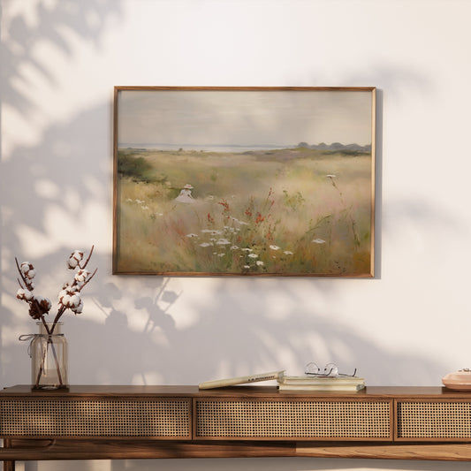 Woman Walking Through Wildflower Field Art Posters