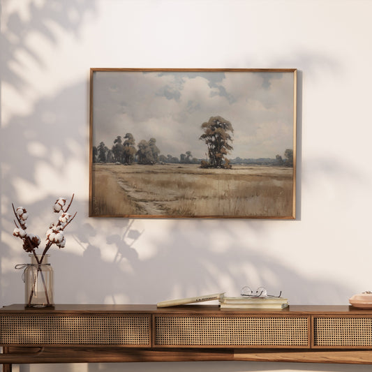 Serene Open Fields and Cloudy Skies Art Posters