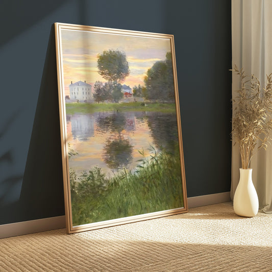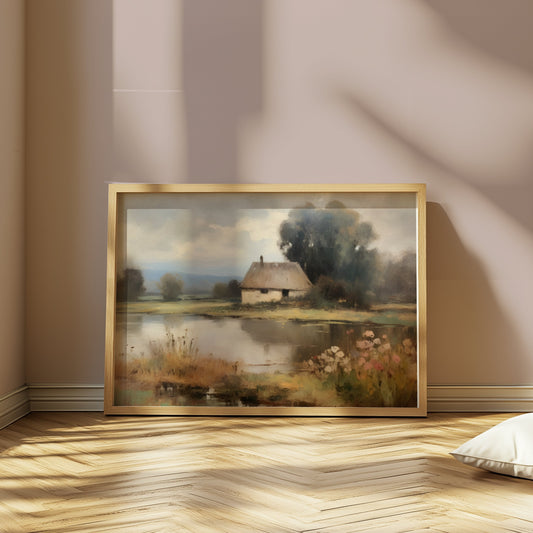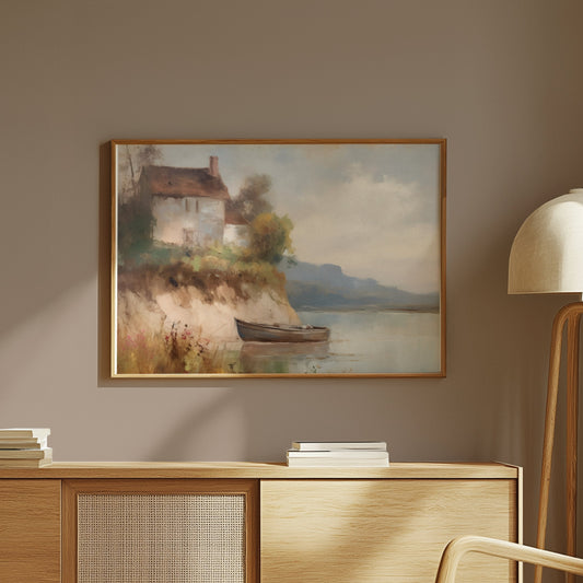 Painting of a Tranquil Cottage by the Lake Posters