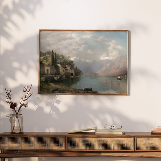 Serene Mountain Lake Village Scene Art Prints Posters