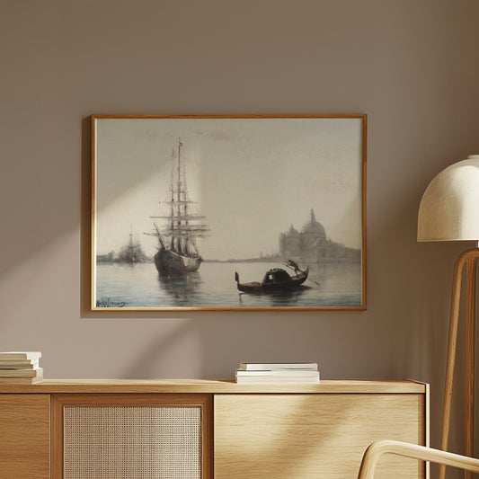 Antique Ship and Gondola Against Historic City Posters