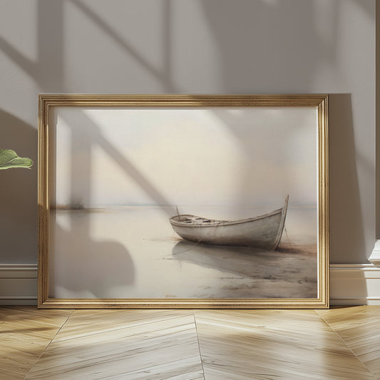 Serene Boat on Misty Lake Landscape Art Posters
