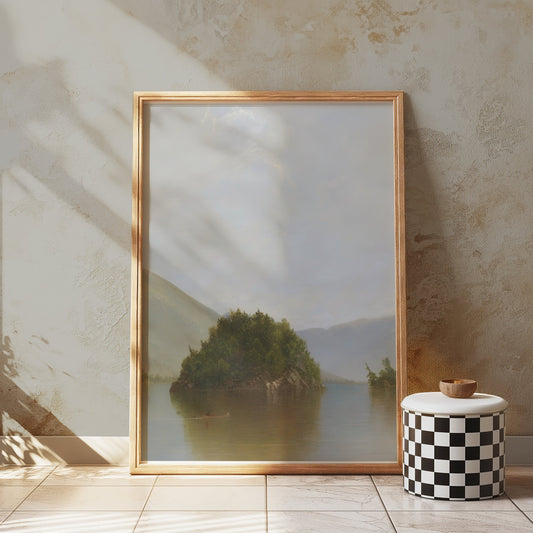 Serene Lake with Island and Mountains Posters