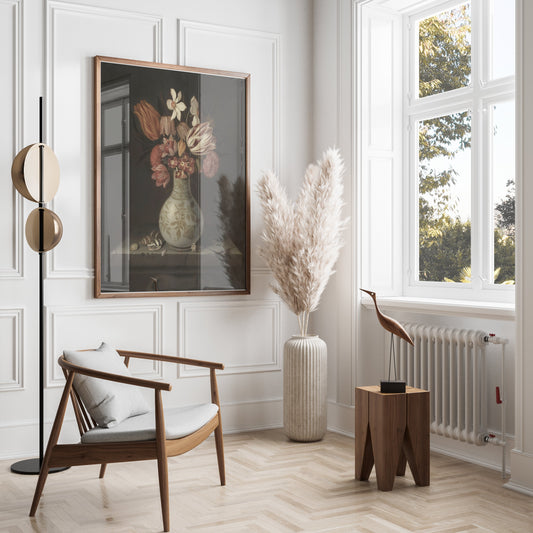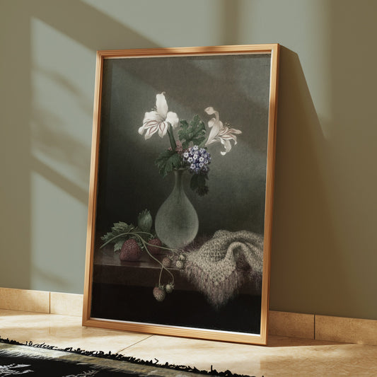 Graceful Floral Still Life with Vase and Strawberries Posters