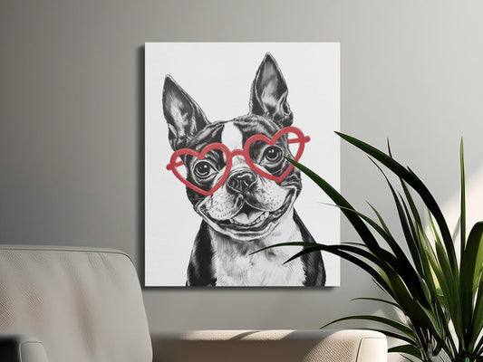 Cute Sketch Boston Terrier With Red Heart Glasses Canvas Wraps