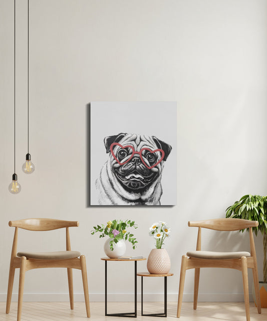 Pug Dog Sketch Wearing Heart Glasses Wall Art Canvas Wraps