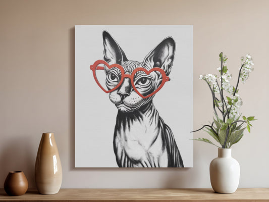 Sphynx Cat Sketched with Heart Glasses Wall Art Canvas Wraps