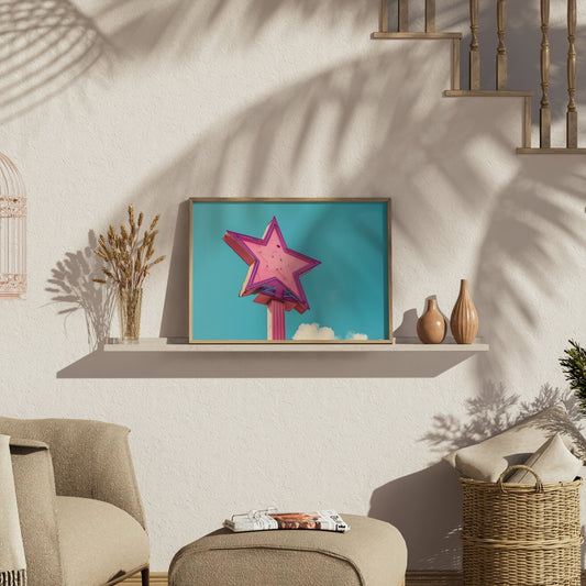 Retro Neon Star Sign With Pastel Sky Background Posters