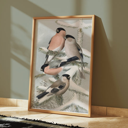 Bullfinch Birds on Snowy Pine Tree Branch Posters