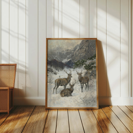Majestic Deer in a Snowy Mountain Landscape Posters