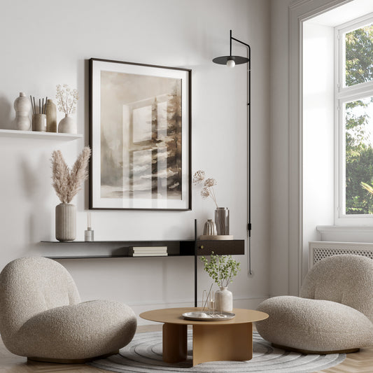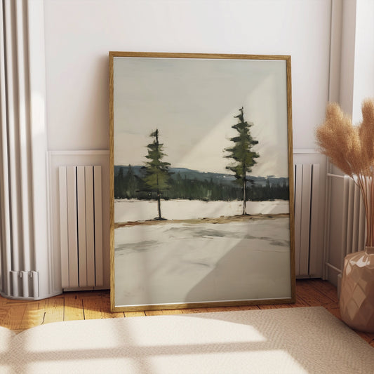 Serene Landscape with Twin Evergreen Trees Posters